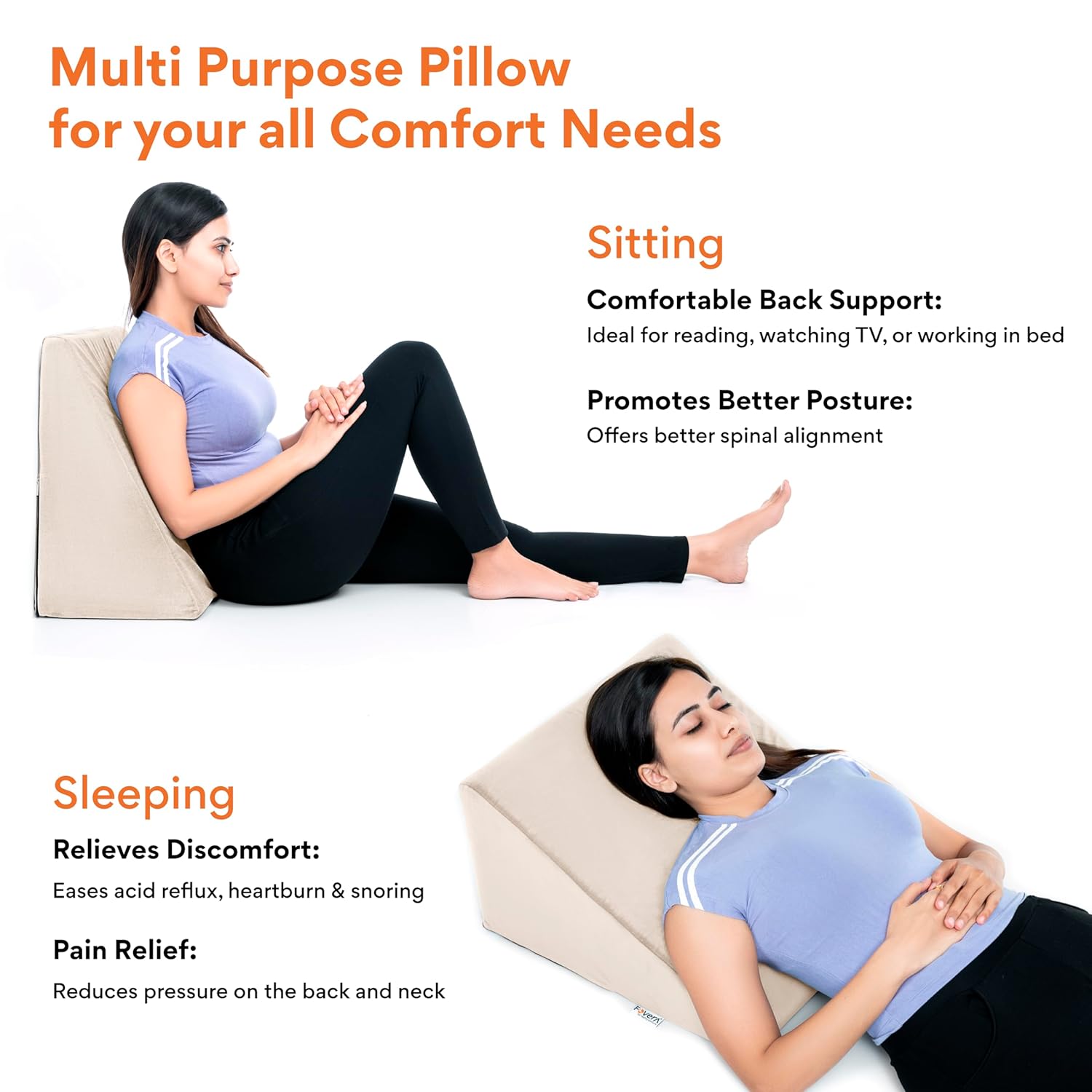 ✅ Multipurpose Bed Wedge Pillow: Relieves acid reflux, back pain, sciatica, heartburn, snoring, coughing, and disturbed sleep. The wedge design improves sleep quality by elevating the head and neck.